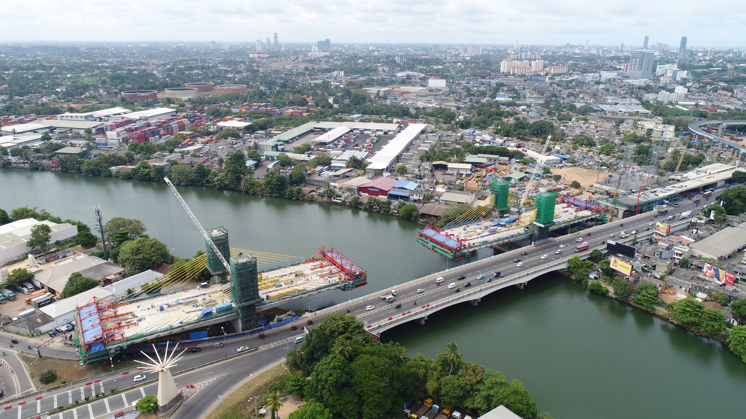 完成したケラニ河新橋は、コロンボ市の北部に位置し、鋼製橋梁工区(パッケージ1)とエクストラドーズド橋工区(同2)の2パッケージで建設工事が進められた。全長は約3km、6車線の高架橋区間も含まれている。借款契約(L/A)が締結されたのは2014年3月。借款額は350億2,000万円。新橋に隣接する既存のケラニ橋に影響を与えない狭小施工、また同国では初となるエクストラドーズド橋の建設などに対応するため、本邦技術活用条件(STEP)が適用され、施工に当たった三井住友建設の高い技術力が生かされた。