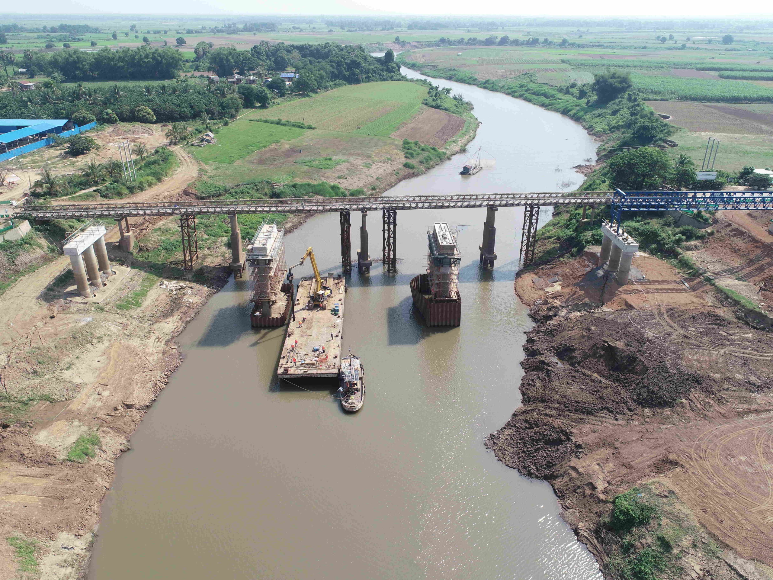だが、既存の一つの橋に大きな変位が生じ、落橋の危険性が高まったため、一刻も早い新橋梁の完成が求められた。また、工事の最盛期であった19年には、メコン河の水位が記録的に上昇した後水位が急速に低下。二つの橋梁の河岸法面が崩壊した。河岸法面を防護するための追加工事を行うため設計変更も迫られた。