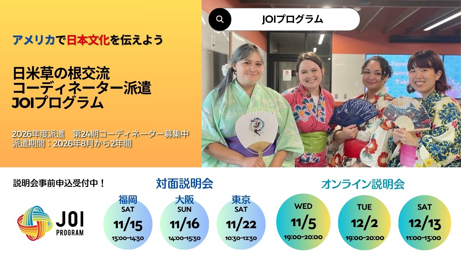 JOIプログラムでは、2026年8月から派遣する第24期のコーディネーターの募集に伴い、説明会を実施いたします。活動内容や米国での生活など、経験者の体験談を直接聞けるチャンスです。オンライン・対面説明会(福岡、大阪、東京)と全6回開催予定ですので、多くの皆様のご参加をお待ちしております。