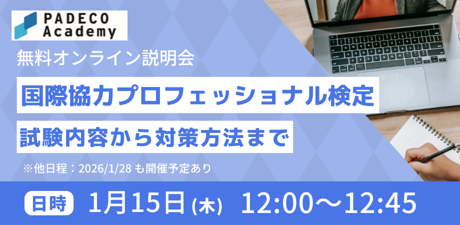 PADECO Academyでは、国際協力に関心のある方を対象に、「国際協力プロフェッショナル検定® 試験対策・検定セット」の無料オンライン説明会を開催いたします。