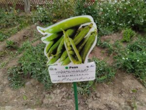 デモ栄養ガーデンのサインボード。本物の野菜を撮影してつくられた。写真はエンドウ豆