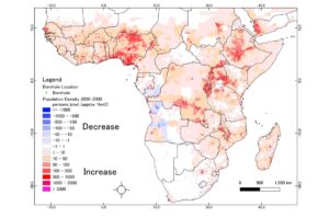 ウガンダでは、政府開発援助(ODA)で建設された給水施設が人口増加による需要の高まりの中で活用されている様子が確認された。また、ハンドポンプ井戸の動力揚水へのアップグレードで、より多くの裨益が期待されることを今後のアプローチ例として示した。一方、依然として給水率の低さ、アップグレード困難な井戸、水質の悪化、維持管理の地域差、学校や保健施設の給水率格差といった、さまざまな課題が地域的に偏って存在していることがわかった。また、井戸データセットに収録された井戸位置=図1=と人口密度の増減=図2=を比べると、村落給水事業の実施地域の多くで人口密度が増加しており、潜在的地域課題の存在が懸念される。