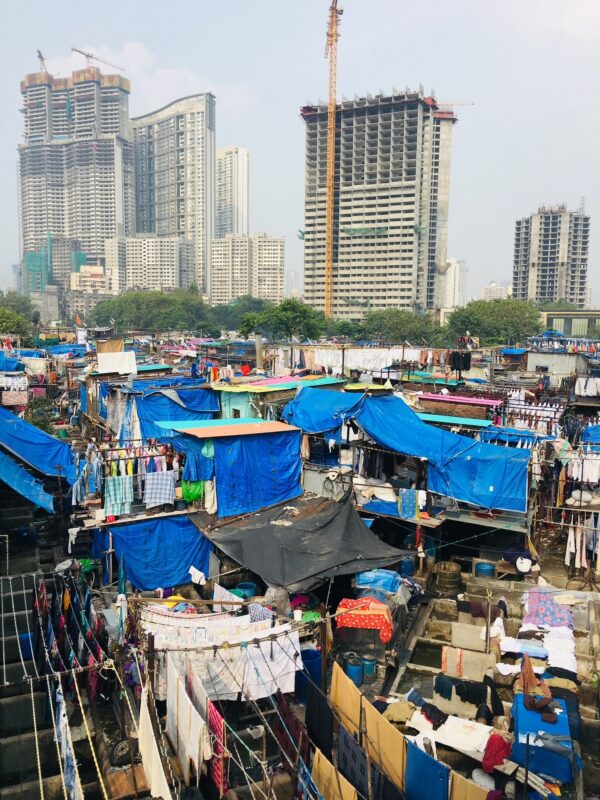 - 都市化の裏で貧富の格 差も深刻化するムンバイ(写真手前は屋外巨大洗濯 場「ドービーガート」