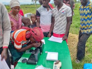 収穫後処理に関するトレーナー研修。グレインスコープで胴割れを観察している様子
