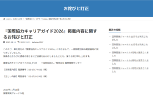 このたび、弊社発行の『国際協力キャリアガイド2026』におきまして、一部掲載団体の電話番号に誤りがございました。 関係各位ならびに読者の皆さまにご迷惑をおかけしましたことを、深くお詫び申し上げます。 国際協力キャリアガイ […]
